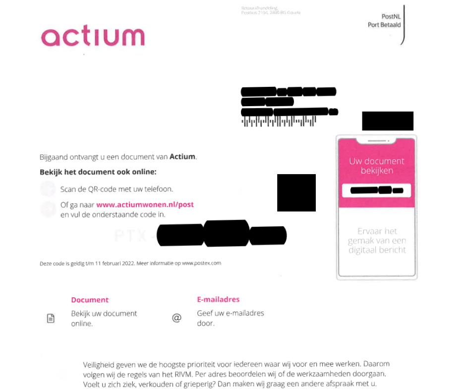 Heb je nog vragen of twijfel je of de post echt van Actium komt? Neem dan contact met ons op. Let op: Postex vraagt nooit naar inloggegevens of wachtwoorden. Geef deze nooit aan anderen.