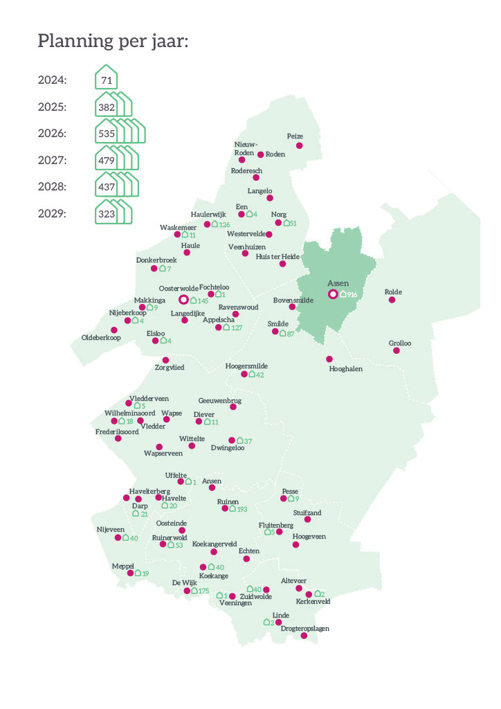 Van 2024 tot 2029 gaan we geleidelijk de 2.400 huizen verbeteren. We zijn begnnen met 200 huizen in het eerste jaar. Elk jaar pakken we meer huizen aan, tot wel 600 per jaar. Zo blijven we op schema om alle 2.400 woningen op tijd klaar te hebben.